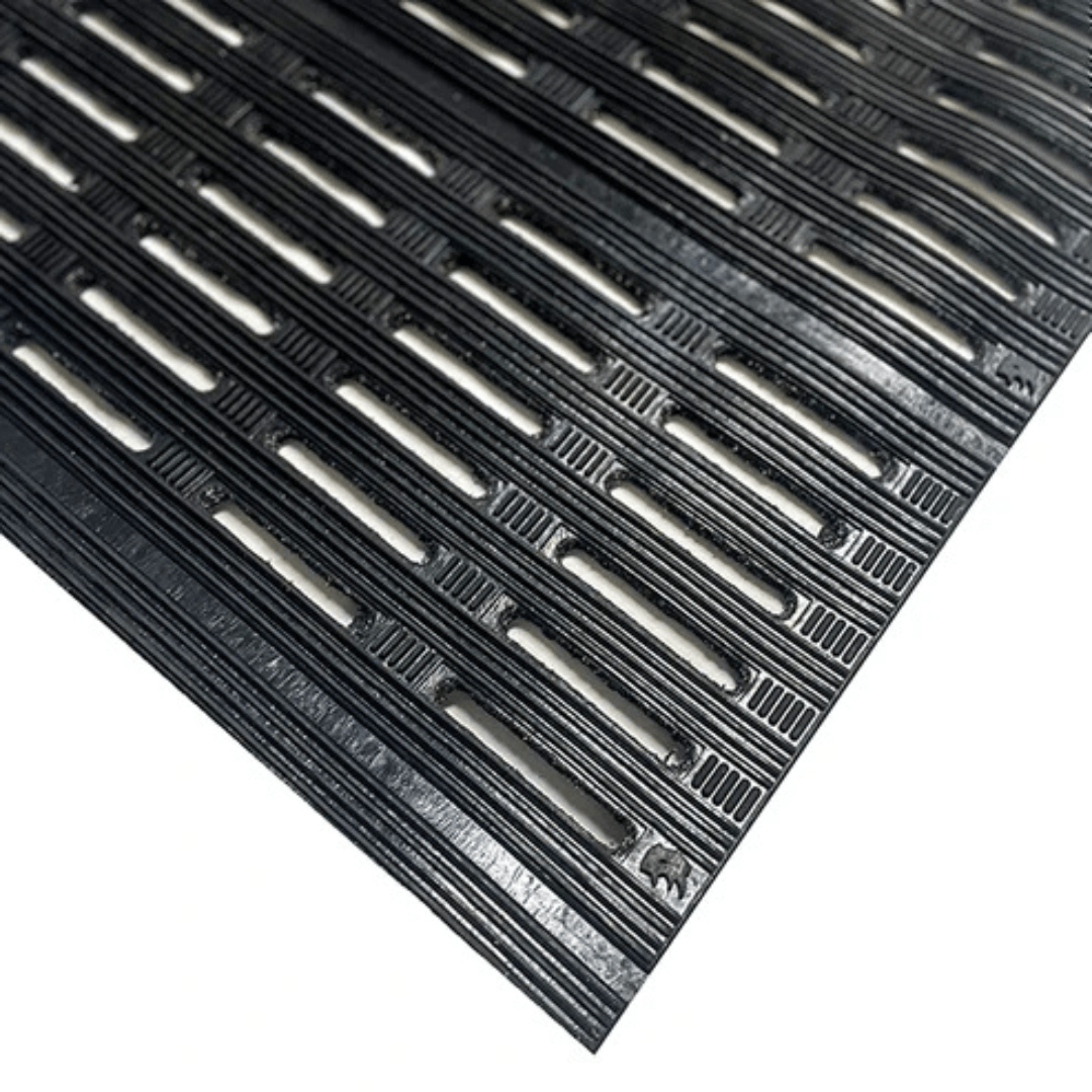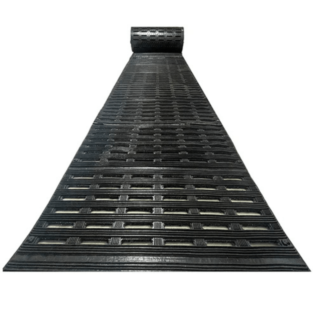 Made from natural Para rubber and reinforced with recycled tire trim from Pirelli and Michelin, the Traktok Mat Runner combines durability with eco-friendly material reuse. The multidirectional V-rib surface and knob-backed construction support stability and long-lasting performance.
